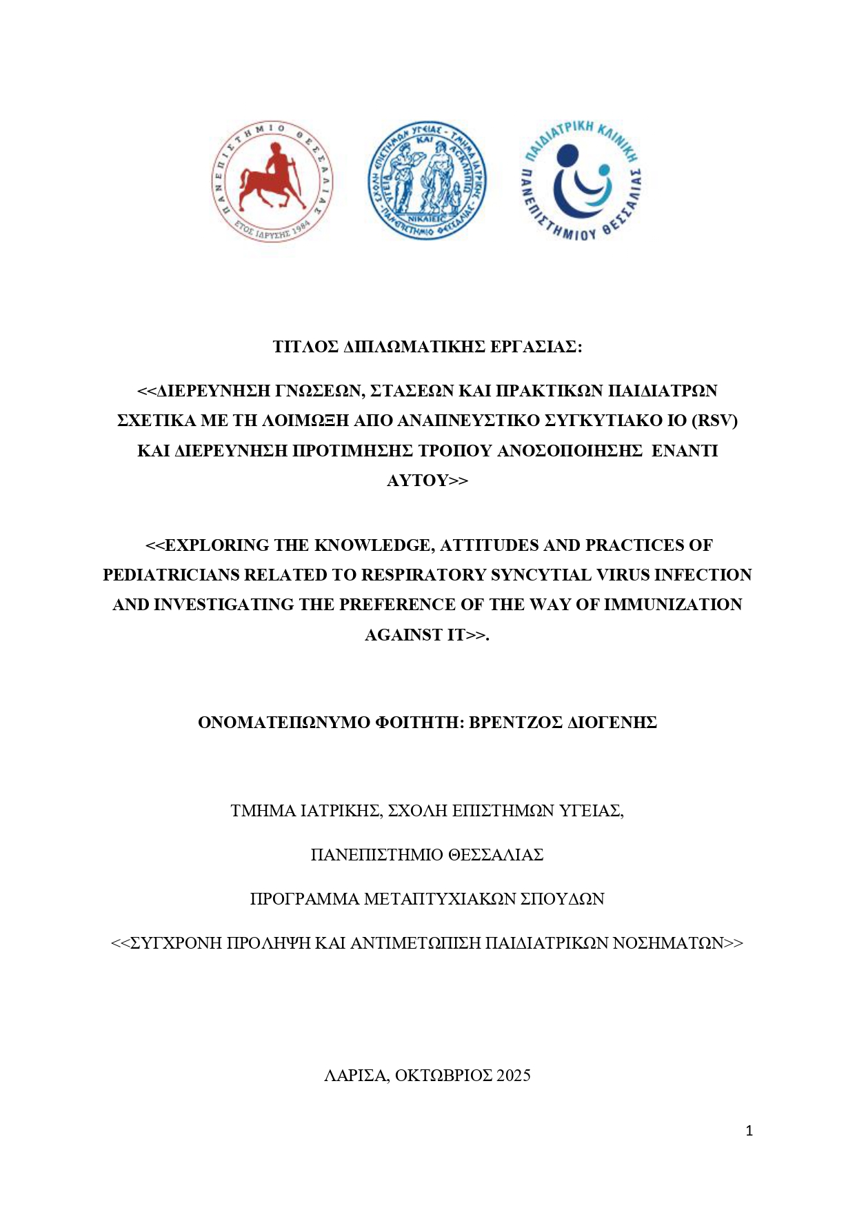 ΔΙΕΡΕΥΝΗΣΗ ΓΝΩΣΕΩΝ, ΣΤΑΣΕΩΝ ΚΑΙ ΠΡΑΚΤΙΚΩΝ ΠΑΙΔΙΑΤΡΩΝ ΣΧΕΤΙΚΑ ΜΕ ΤΗ ΛΟΙΜΩΞΗ ΑΠΟ ΑΝΑΠΝΕΥΣΤΙΚΟ ΣΥΓΚΥΤΙΑΚΟ ΙΟ (RSV) ΚΑΙ ΔΙΕΡΕΥΝΗΣΗ ΠΡΟΤΙΜΗΣΗΣ ΤΡΟΠΟΥ ΑΝΟΣΟΠΟΙΗΣΗΣ ΕΝΑΝΤΙ ΑΥΤΟΥ