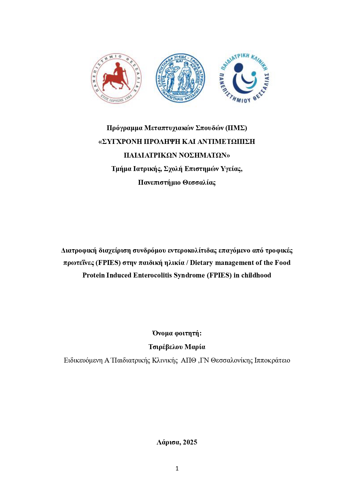 ΔΙΑΤΡΟΦΙΚΗ ΔΙΑΧΕΙΡΙΣΗ ΣΥΝΔΡΟΜΟΥ ΕΝΤΕΡΟΚΟΛΙΤΙΔΑΣ ΕΠΑΓΟΜΕΝΟ ΑΠΟ ΤΡΟΦΙΚΕΣ ΠΡΩΤΕΙΝΕΣ (FPIES) ΣΤΗΝ ΠΑΙΔΙΚΗ ΗΛΙΚΙΑ