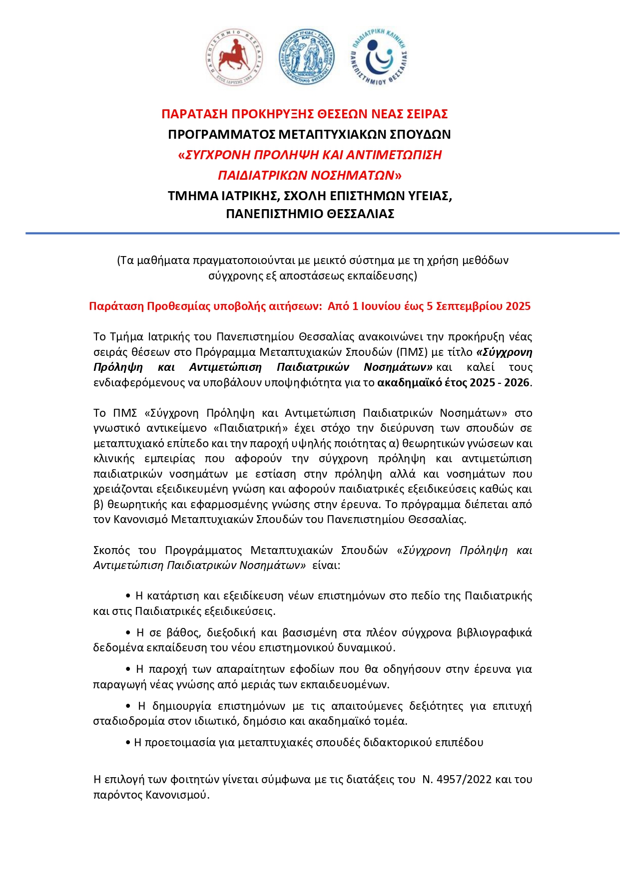 Το Τμήμα Ιατρικής του Πανεπιστημίου Θεσσαλίας ανακοινώνει την προκήρυξη νέας σειράς θέσεων στο Πρόγραμμα Μεταπτυχιακών Σπουδών (ΠΜΣ) με τίτλο «Σύγχρονη Πρόληψη και Αντιμετώπιση Παιδιατρικών Νοσημάτων» και καλεί τους ενδιαφερόμενους να υποβάλουν υποψηφιότητα για το ακαδημαϊκό έτος 2025 - 2026.