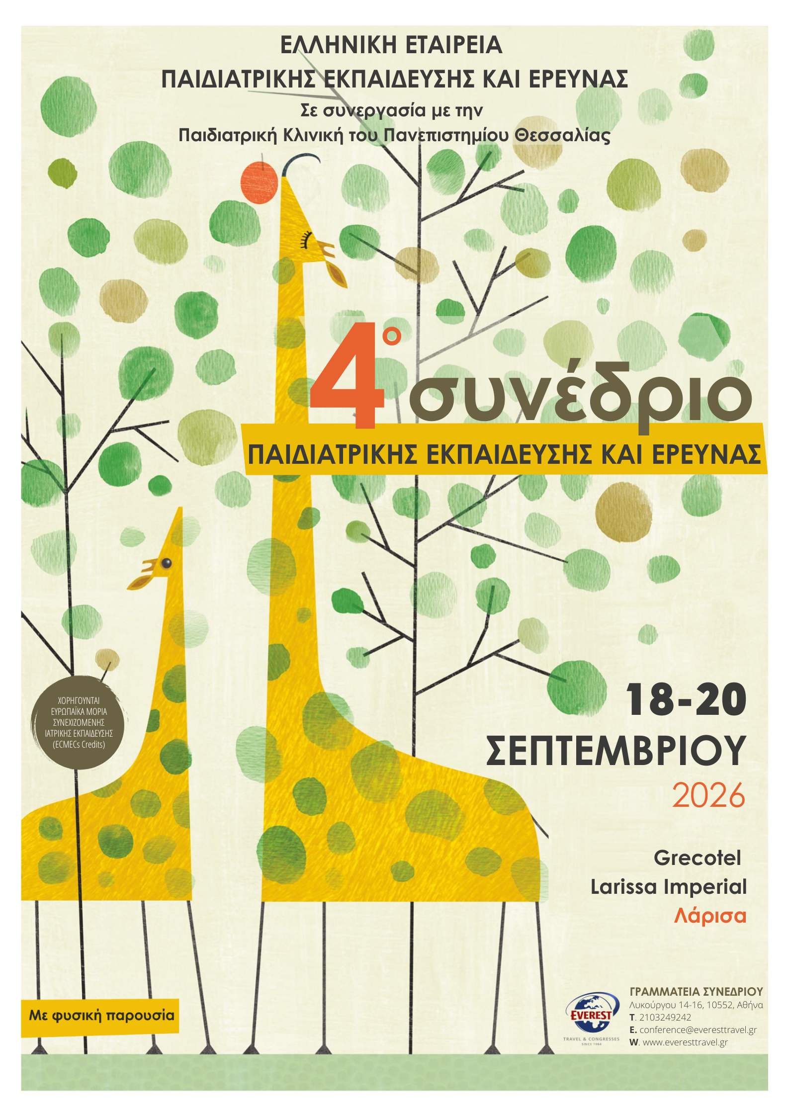 Με ιδιαίτερη χαρά σας καλωσορίζουμε στο 4ο Συνέδριο Παιδιατρικής Εκπαίδευσης και Έρευνας, το οποίο διοργανώνεται υπό την αιγίδα της Ελληνικής Εταιρείας Παιδιατρικής Εκπαίδευσης και Έρευνας (ΕΕΠΕΚΕ) και σε συνεργασία με την Παιδιατρική Κλινική του Πανεπιστημίου Θεσσαλίας. Το Συνέδριο θα πραγματοποιηθεί με φυσική παρουσία στις 18–20 Σεπτεμβρίου 2026, στο ξενοδοχείο Grecotel Larissa Imperial στη Λάρισα, συνεχίζοντας έναν επιστημονικό θεσμό αφιερωμένο στη συνεχή αναβάθμιση της παιδιατρικής γνώσης και πράξης.